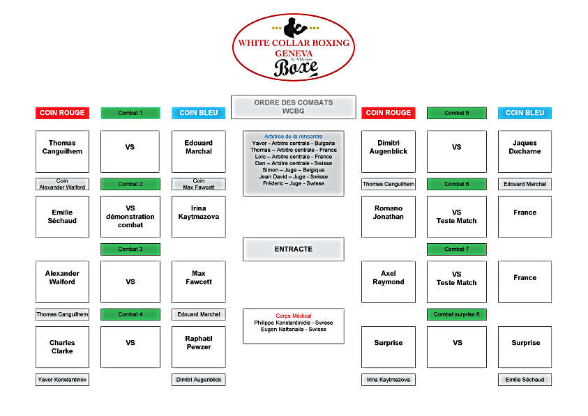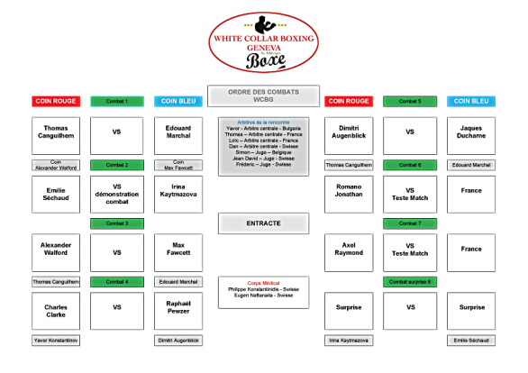 Vous pourrez assister à 7 combats au total (6 combats WCBG et 1 combats amateur en test match) autour d’un dîner